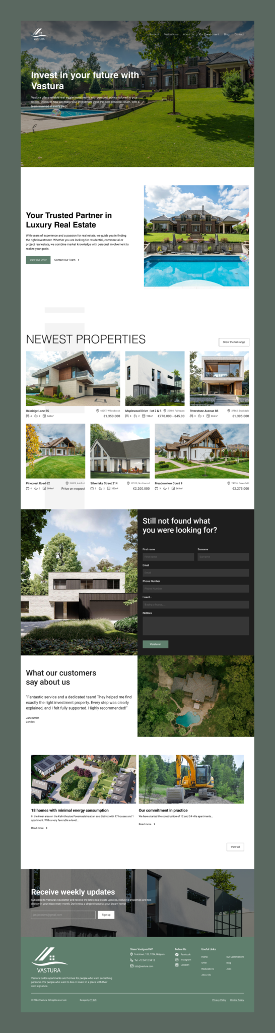 Het eindresultaat van dit persoonlijk webdesignproject voor vastgoed is een doordachte en visueel krachtige homepagina die een vastgoedkantoor positioneert als een betrouwbare en professionele speler in de markt. Het ontwerp straalt klasse uit en maakt indruk, zonder af te leiden van het uiteindelijke doel: conversie. Door een slimme combinatie van modern webdesign en gebruiksvriendelijkheid voelt de website intuïtief aan en nodigt hij bezoekers uit om actie te ondernemen. Of het nu gaat om het aanvragen van meer informatie, het plannen van een bezichtiging of het simpelweg verkennen van het aanbod, alles voelt logisch en natuurlijk aan. Dit project laat zien hoe een sterke online aanwezigheid het verschil kan maken in de vastgoedsector en zet een nieuwe standaard voor vastgoedwebsites.